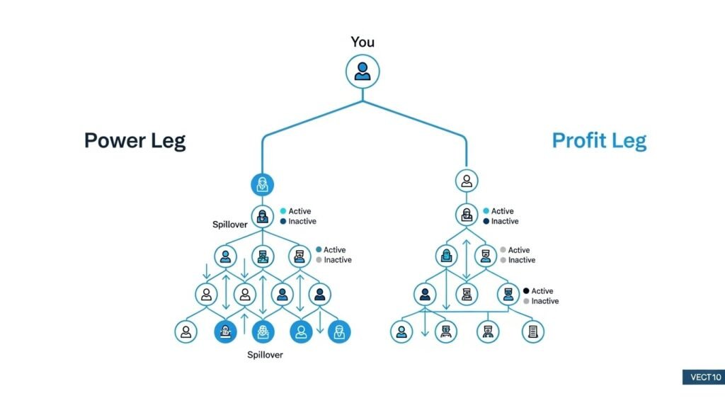 Every new user joins the network under someone using the Power Leg and Profit Leg (also known as weak leg).
